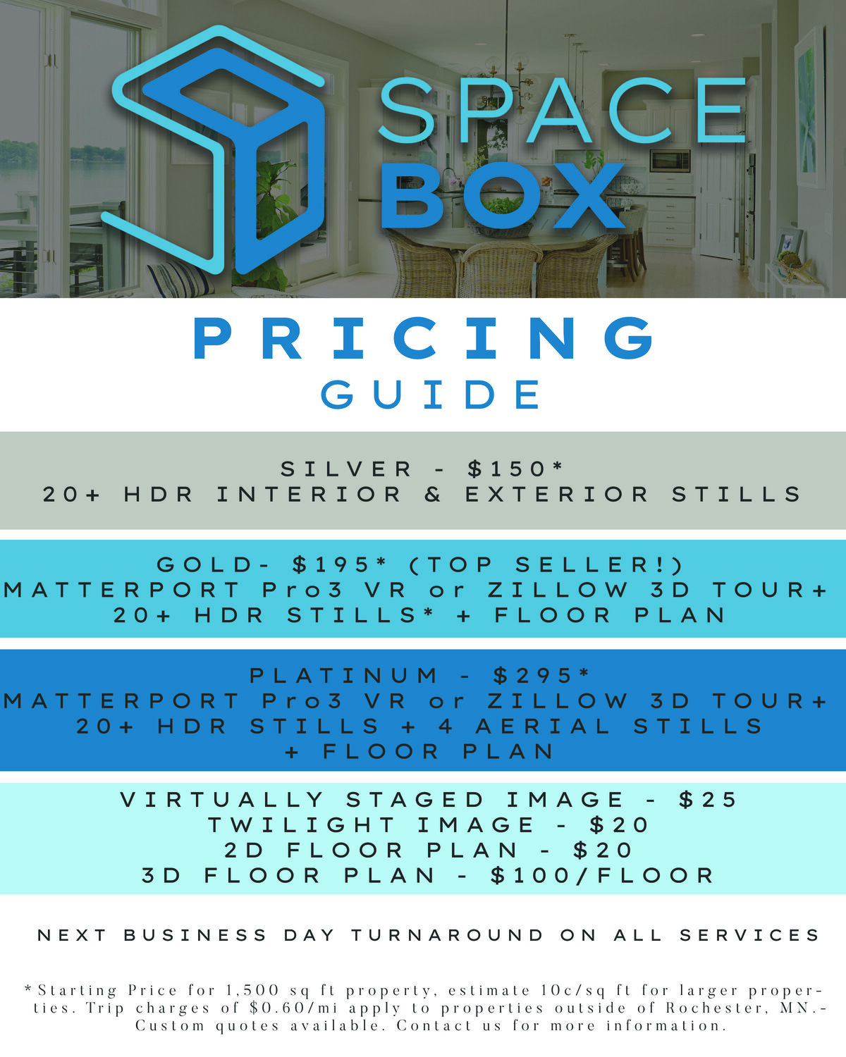 We have SO much more. Package pricing above for Drone, Aerials, Still Photography (Stills), Matterport Pro3 VR virtual reality virtual tours. For any of our other offerings, please reach out for a custom quote on your project today!